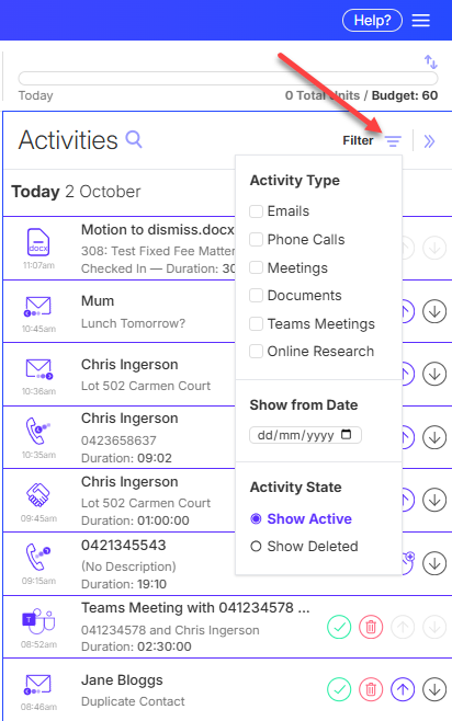 Use the activity feed filters to easily find the activities you’re looking for. You can filter by Activity Type, Date, or Status.