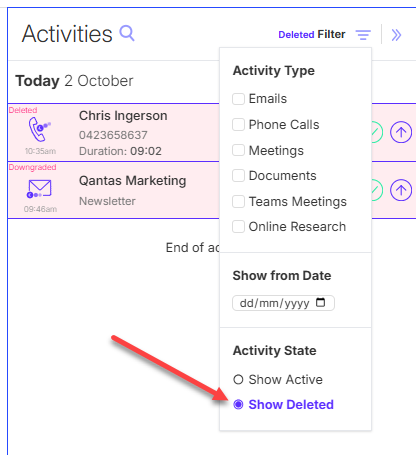 To retrieve deleted activities or downgraded contacts, open the activity feed filters and click Show Deleted.