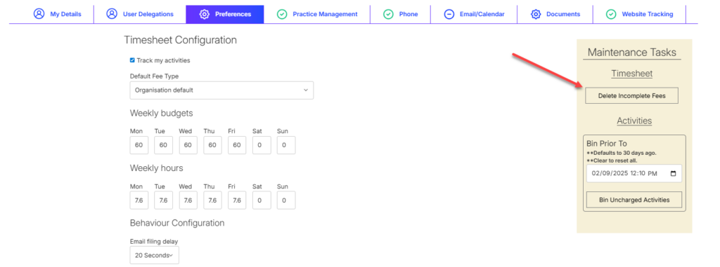 To delete all incomplete time entries, click Delete Incomplete Fees.
