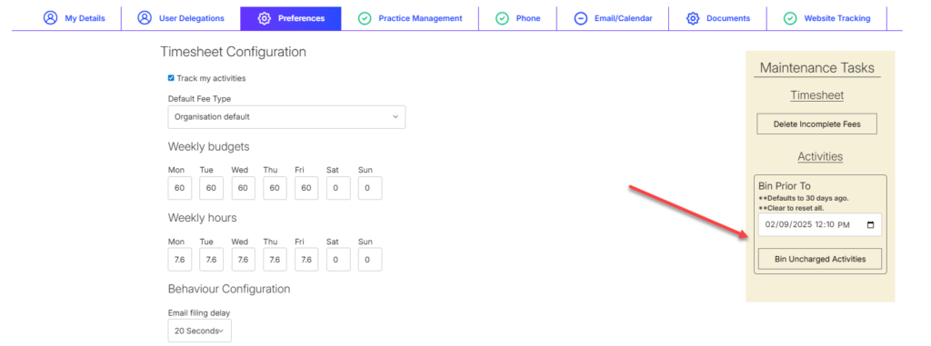 To delete all activities prior to a particular date, enter the date and click Bin Uncharged Activities.