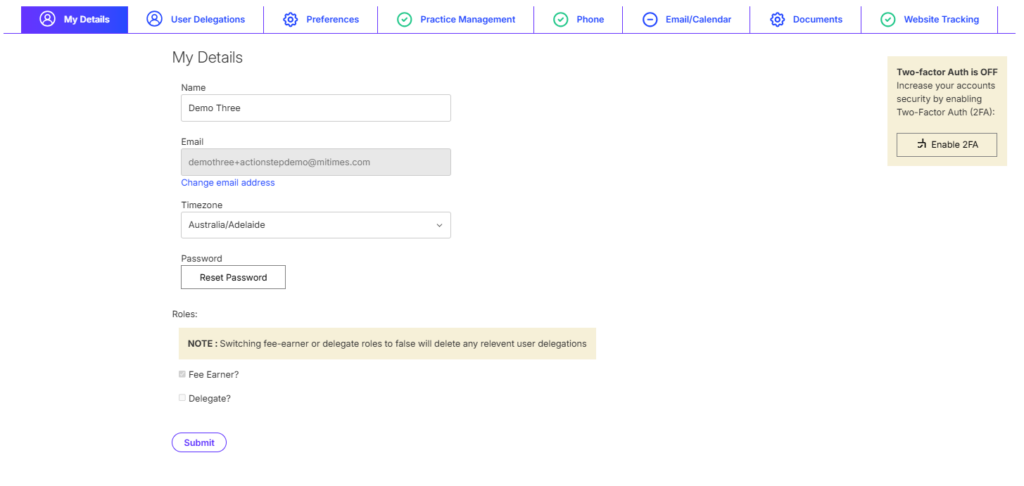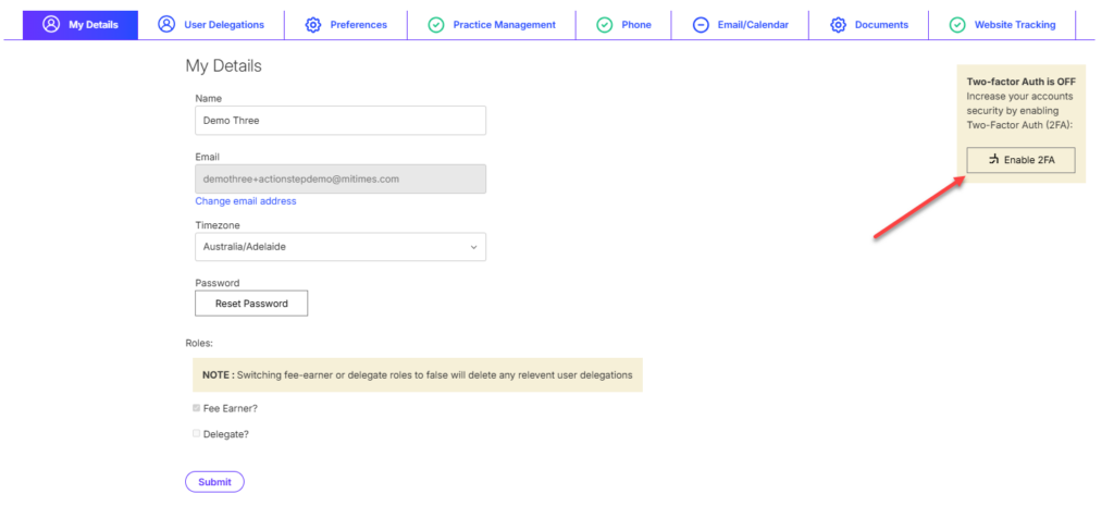 To enable 2FA, head to the My Details tab in My Profile and click Enable 2FA.