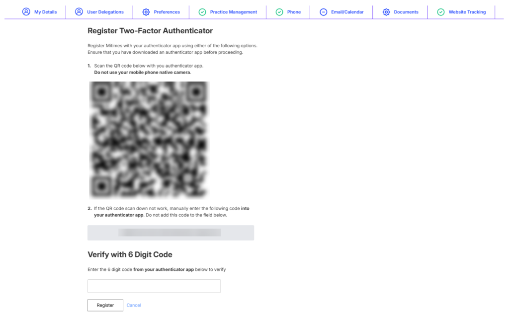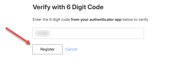 After scanning the QR Code, enter the 6 digit verification code from your authenticator app and click Register to finish enabling 2FA.