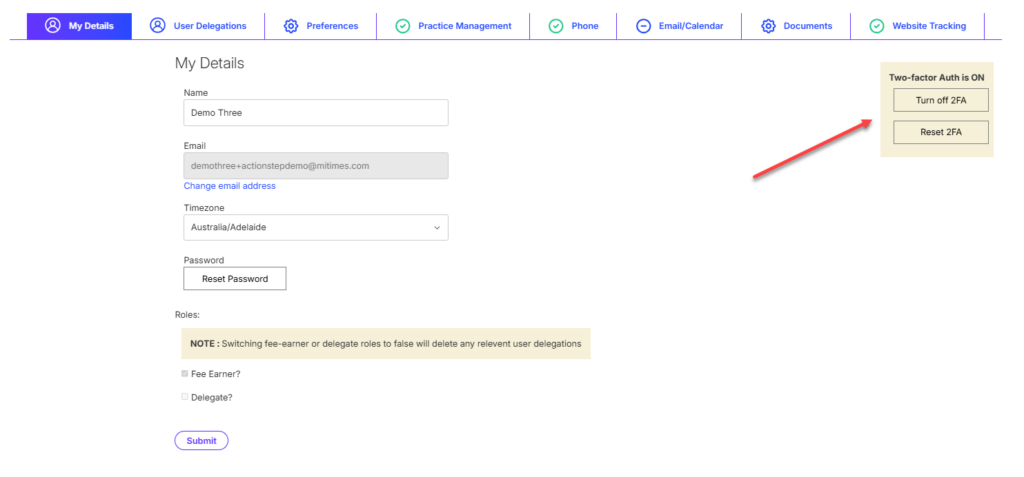 You can disable or reset 2FA from the My Details tab in My Profile.